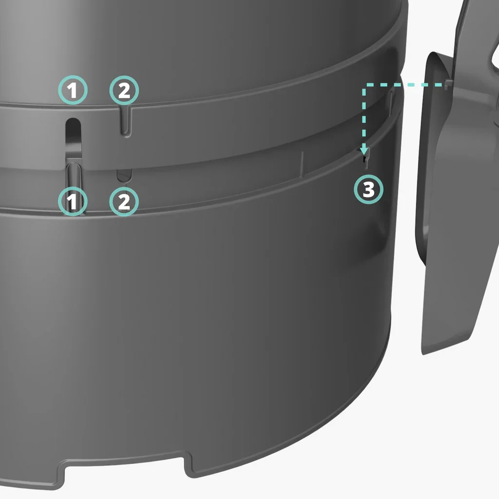The scoop has a mount hook (3) near the thumb grips on the handle. The hook on the scoop will slide downwards into the slot on the base container. In this position the scoop will perfectly contour the base container for tidy storage.