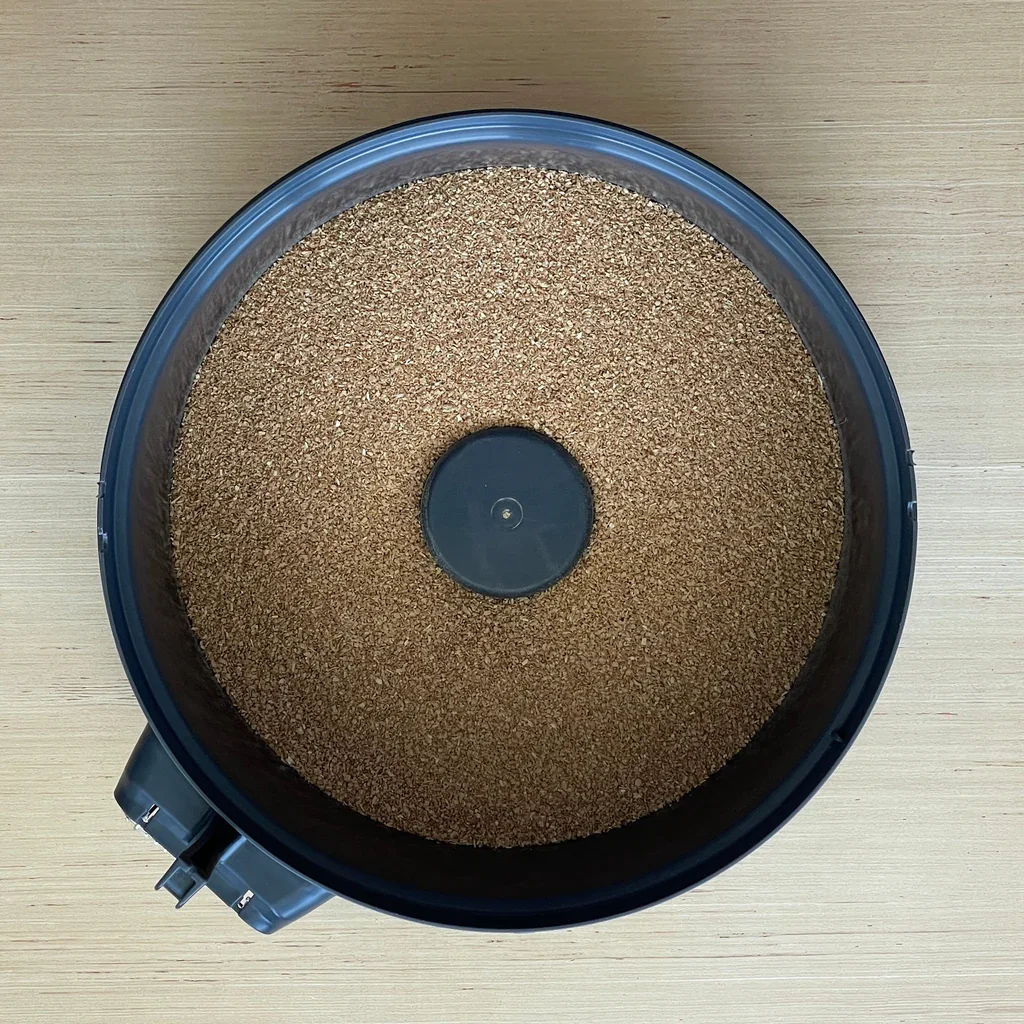 Fill with litter to a depth of ~2 to 2.25 inches (5 - 5.5 cm). For reference, the landing pad in the center is 2.6" deep, so the perfect litter depth will occur when the litter level is about ~1/2" below the landing pad.