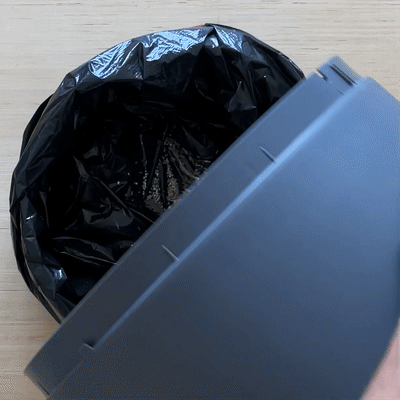 The litter in Boxscoop Curve should stay fresh for 3-10 weeks, depending on which litter type you are using. The easiest way to perform complete litter changes is to line the cover with a bag, and then lift Boxscoop Curve and pour the old litter into the bag: