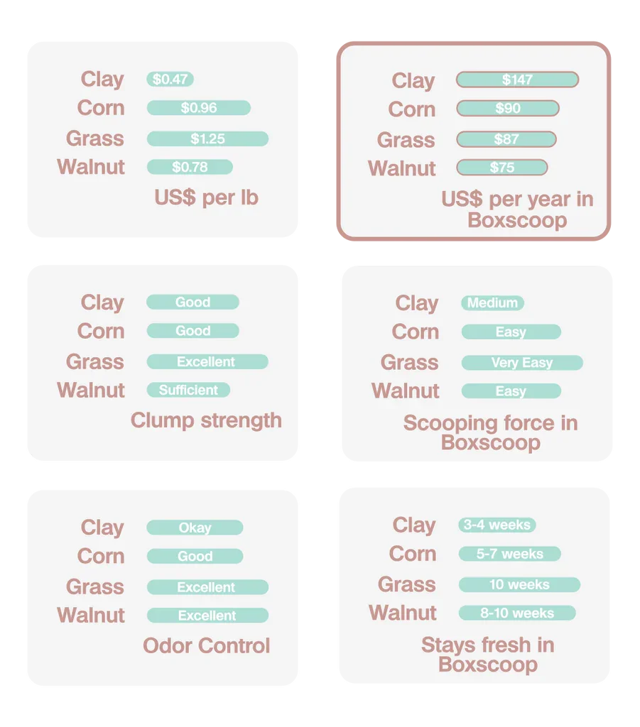 Alternative clumping litters like corn, grass, walnut and many others are steadily advancing. We engineered subtle features into Boxscoop so that it'll perform with many of these alternative litters. In general we find these litters to be lighter, cleaner, healthier and stay fresh much longer.