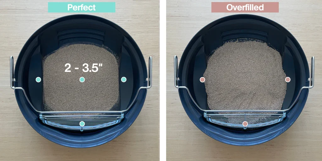 Fill with litter so the center point is between 2-3.5 inches deep (5 - 8 cm). For reference, the center is 3.5" deep when the litter surface is slightly below the 3 green dots below: